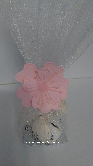 Contin: bile plantabile albe in decor tulle alb, instructiuni de plantare si floare de cires roz.