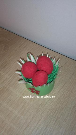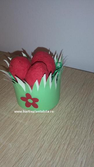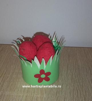 Am creat un cosulet care imita iarba in 2 culori, am asezat 3 bile plantabile modelate in forma de oua pe un pat de material decorativ verde si….acesta este rezultatul.