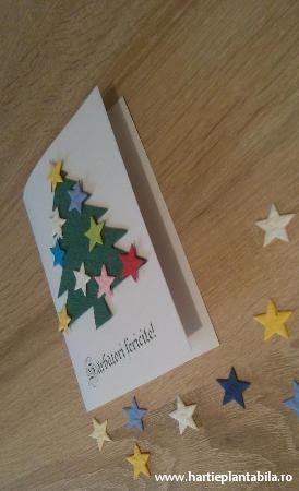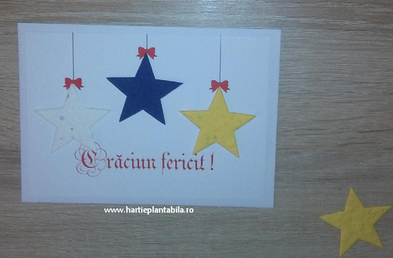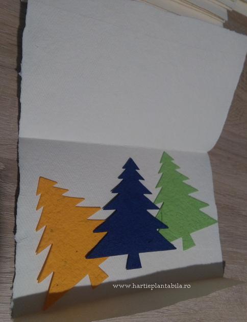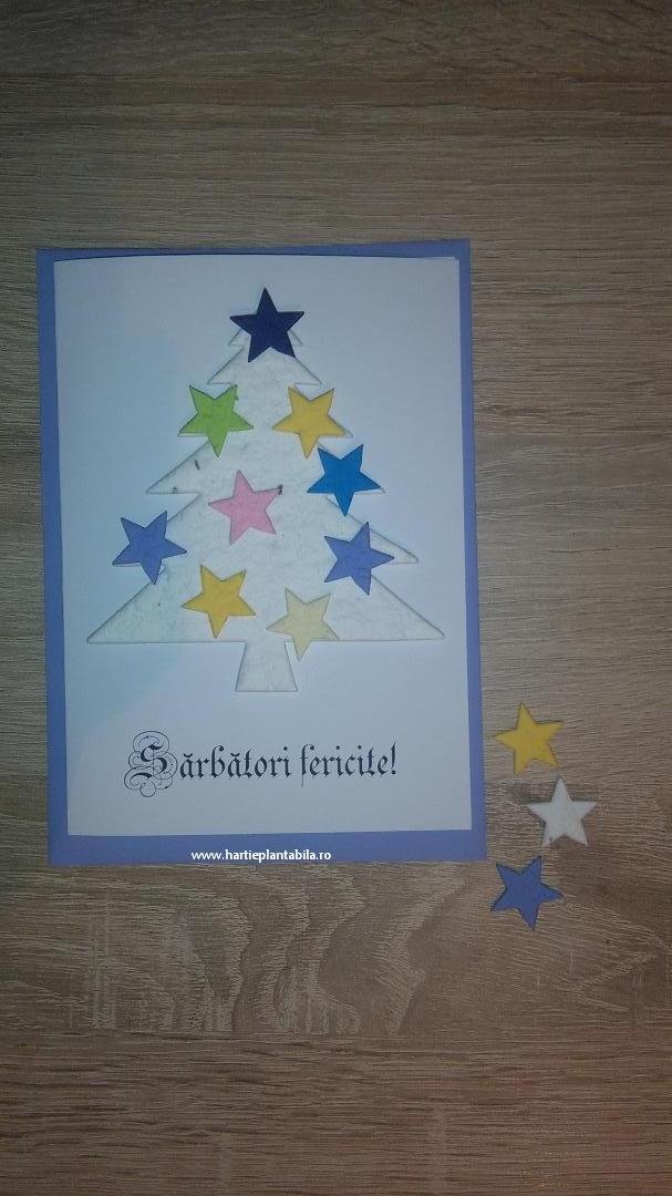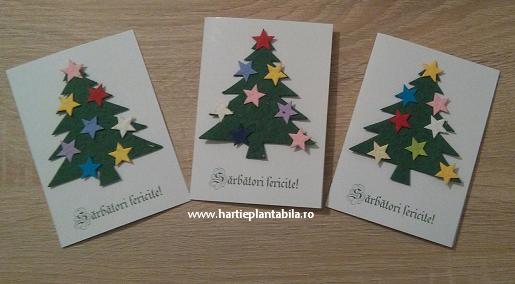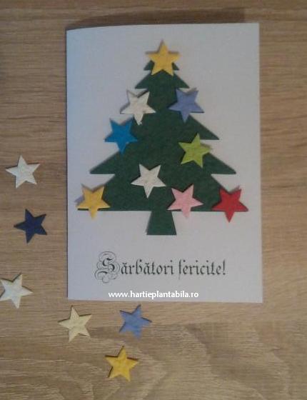 Acest model este realizat in marime A5, avand baza din carton, cu mesaj personalizat, cardurile atasate bradut si stelute fiind din hartie plantabila (evident, doar ele se planteaza 🙂 ). Felicitarea are plic asortat si instructiuni de plantare. Bradutii pot fi albi, verzi sau rosii, iar stelutele pot avea diferite culori, aranjarea lor depinzand de inspiratia noastra din momentul realizarii fiecarei felicitari.