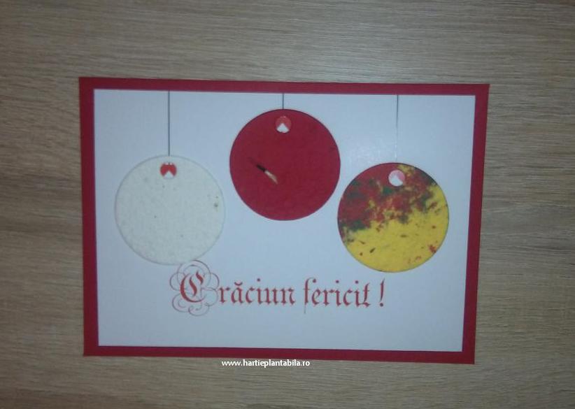Este realizat in marime A5, avand baza din carton, cu mesaj personalizat, cardurile atasate in forma de globuri fiind din hartie plantabila. Felicitarea are plic asortat si instructiuni de plantare. Globurile sunt diferite ca si culoare, unul dintre ele fiind realizat in 3 culori specifice Craciunului.