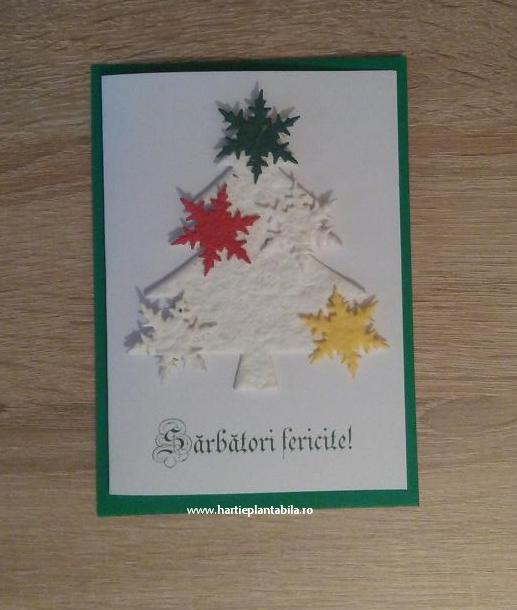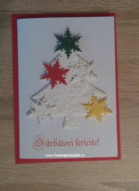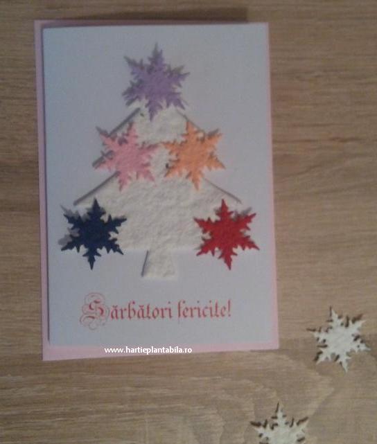Acest model este realizat in marime A5, avand baza din carton, cu mesaj personalizat, cardurile atasate: bradut si fulgi de nea fiind din hartie plantabila (evident, doar ele se planteaza 🙂 ). Felicitarea are plic asortat si instructiuni de plantare. Bradutii sunt albi, evident, ca-s ninsi 😛 , iar fulgii de nea pot avea diferite culori, aranjarea lor depinzand de inspiratia noastra din momentul realizarii fiecarei felicitari.