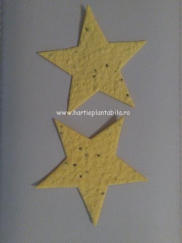 Acest model este realizat in marime A5, avand baza din carton, cu mesaj personalizat, iar cardurile atasate in forma de stelute fiind din hartie plantabila. Felicitarea are plic asortat si instructiuni de plantare. Stelutele pot avea diferite culori, aranjarea lor depinzand de inspiratia noastra din momentul realizarii fiecarei felicitari.