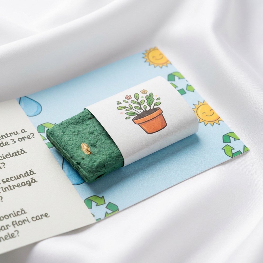 La Hârtie Plantabilă, susținem educația verde prin fapte. Broșura este realizată pe materiale sustenabile și prietenoase. Mixul de semințe ajută direct albinele și polenizatorii. Stickerul asortat completează designul eco al produsului. Oferim o soluție etică pentru a inspira noua generație. Sustenabilitatea începe cu o poveste și cu plante crescute cu drag.