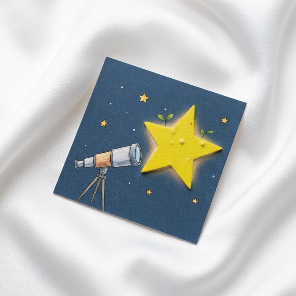 Acest cartonaș nu este doar o simplă ilustrație, ci o experiență completă. Designul aduce în prim-plan curiozitatea specifică vârstei: un telescop îndreptat spre o stea galbenă. Magia acestui produs stă în faptul că steaua este realizată manual din hârtie biodegradabilă, îmbogățită cu mix de semințe de flori de vară. (Atenție: se plantează doar steluța galbenă, în timp ce cartonașul de suport îi rămâne copilului ca amintire!).