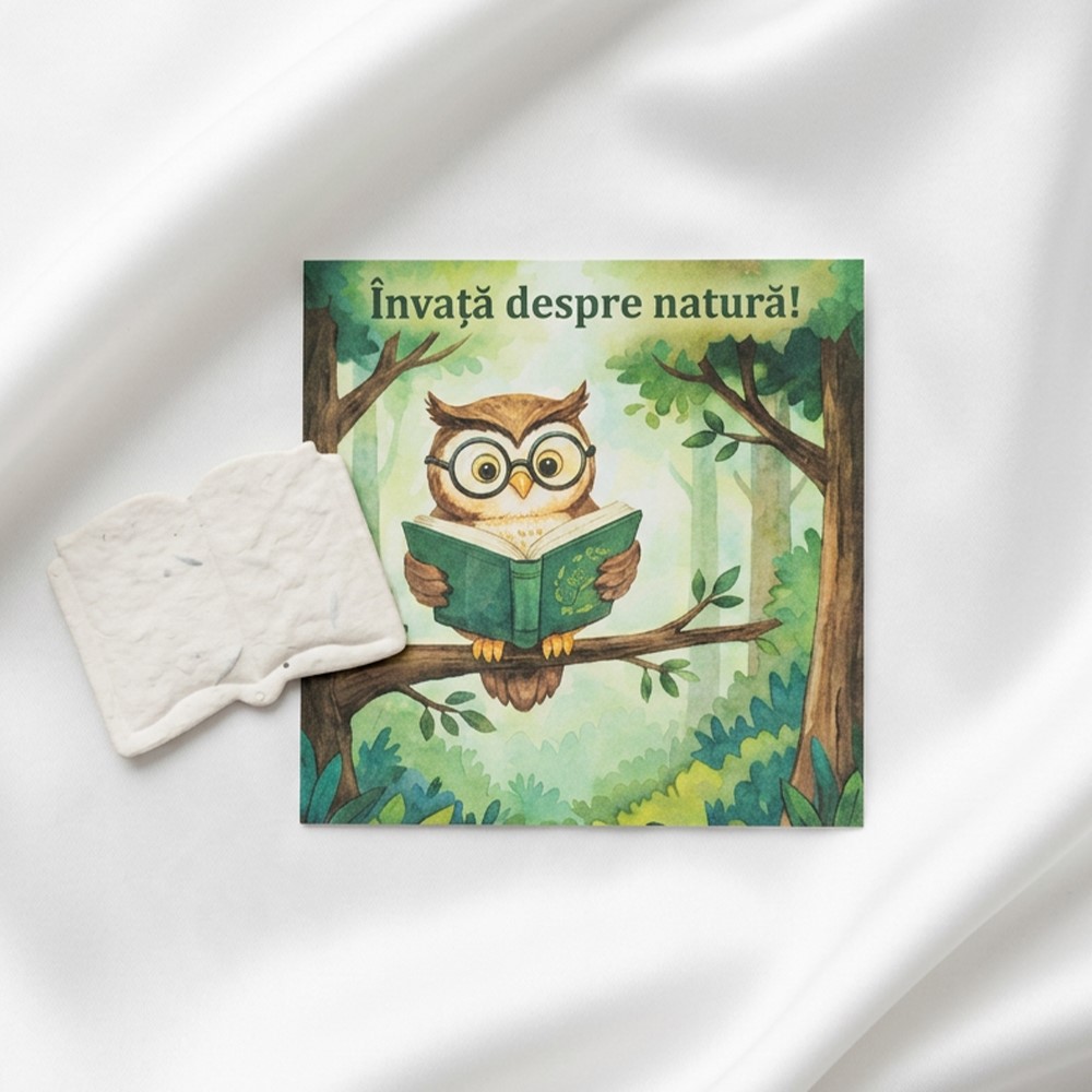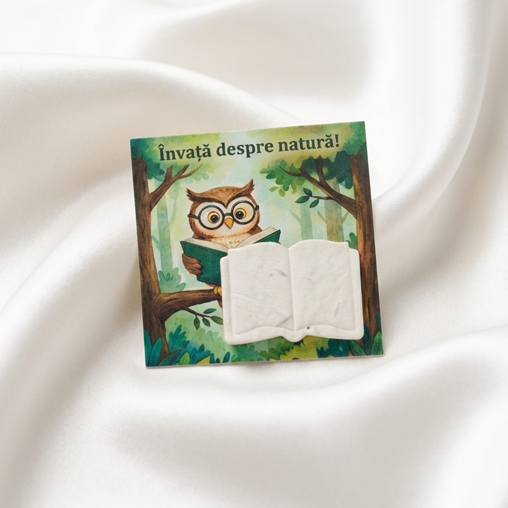 „Micul Înțelept” nu este doar un cartonaș, ci o metaforă despre cum învățătura ne ajută să înflorim. Ilustrația caldă și plină de detalii încadrează perfect elementul special: o carte albă, realizată din hârtie biodegradabilă care conține un mix de semințe de flori. Este un simbol puternic – așa cum citim pentru a ne hrăni mintea, plantăm pentru a hrăni pământul. (De reținut: se plantează doar figurina albă sub formă de carte).