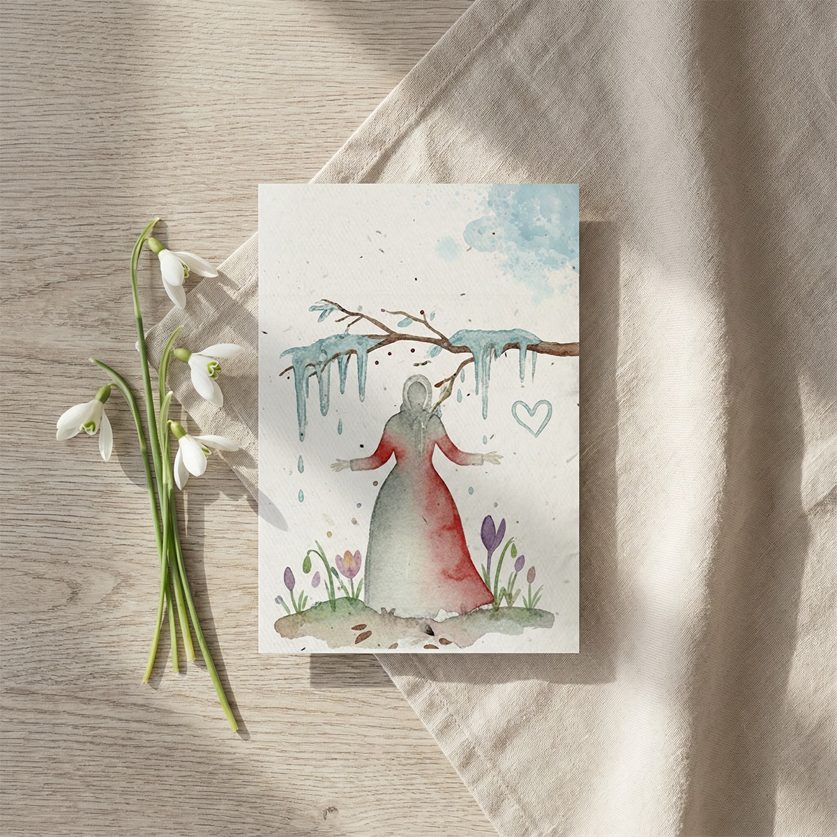 Felicitare plantabilă cu ilustrație unicat „Ziua 6” (dezghețul), dimensiune 11×7,5 cm.