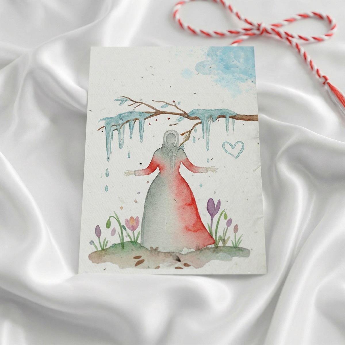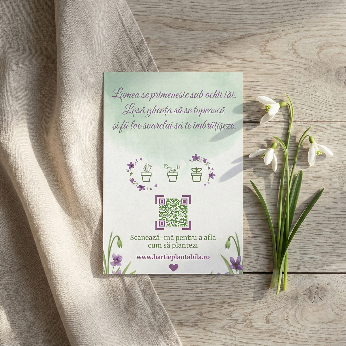 Felicitarea din hârtie plantabilă și cartonașul cu poveste sunt prinse manual cu un șnur bicolor, simbolizând trecerea de la rece la cald.