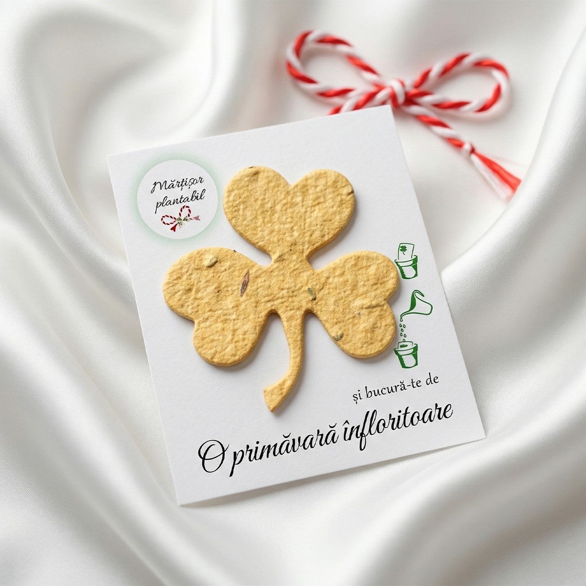 Pe cartonașul decorat cu urarea „O primăvară înfloritoare”, vei găsi atașată o figurină – un trifoi norocos, o floare delicată sau o frunză, realizată manual din hârtie plantabilă.