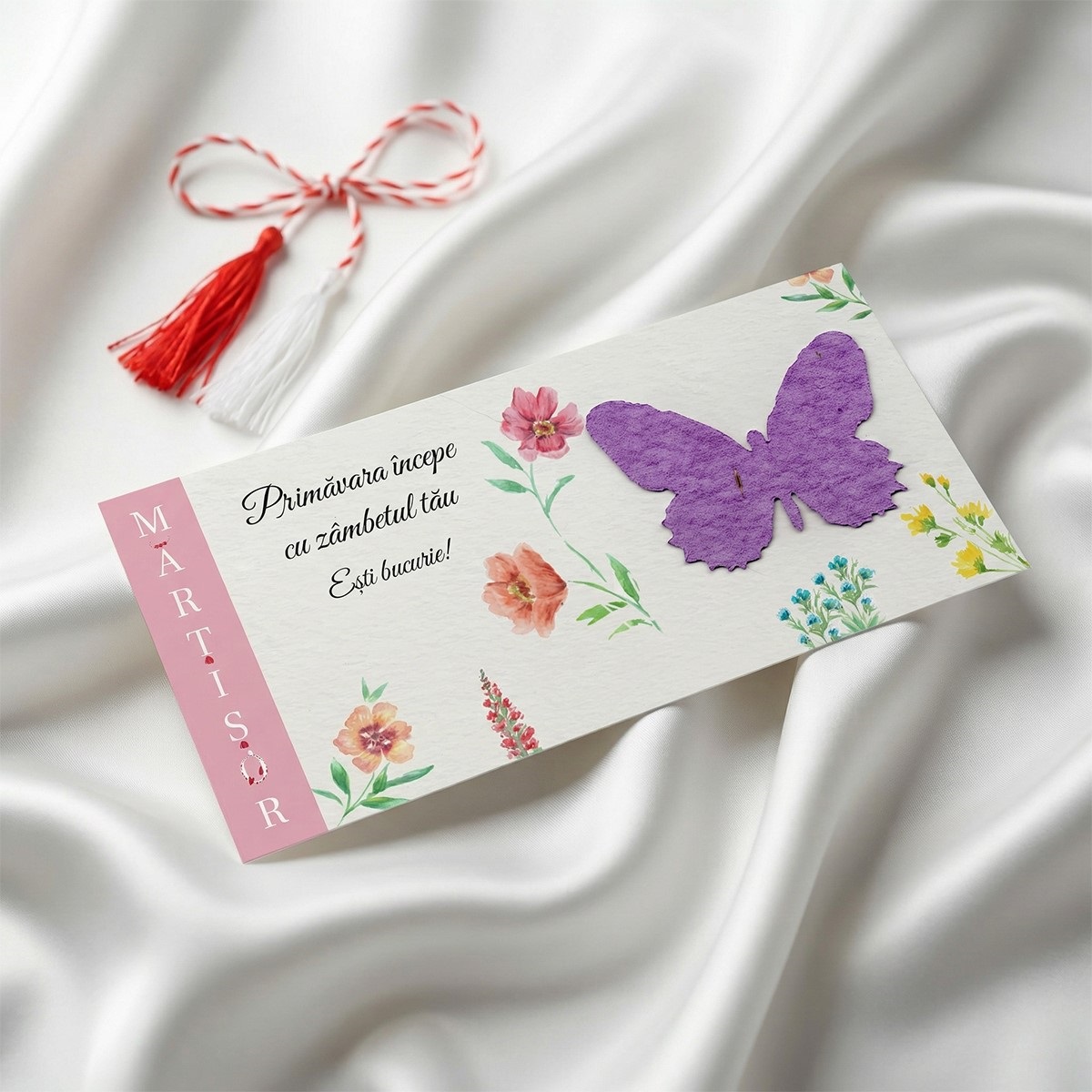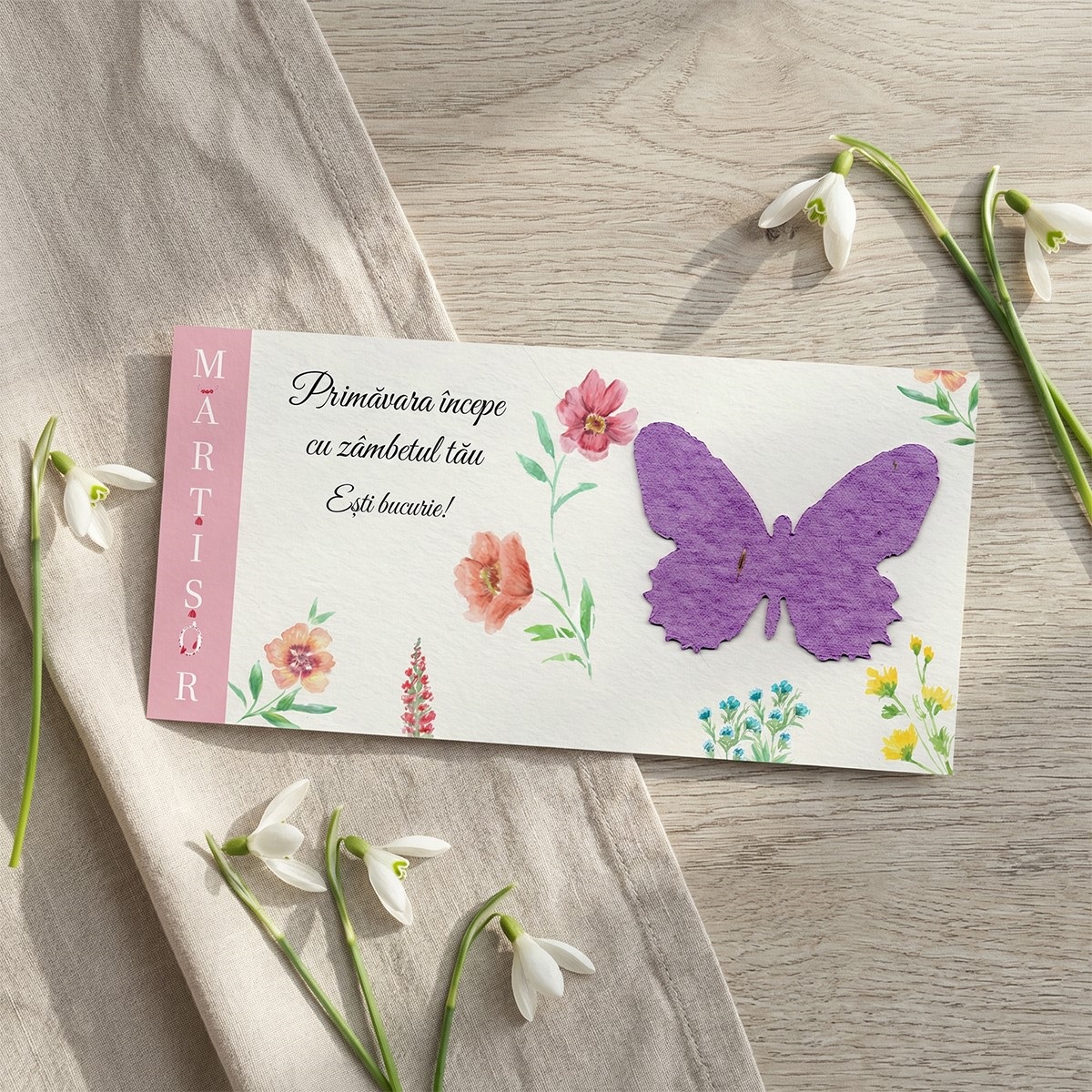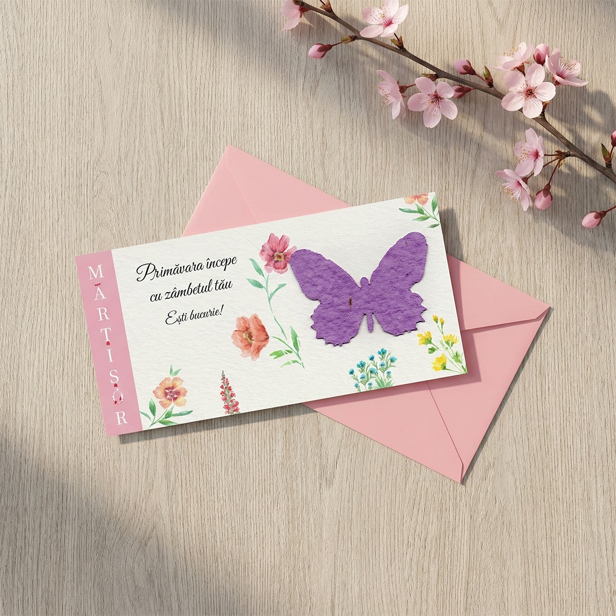Formatul panoramic conferă distincție, iar plicul roz transformă mărțișorul într-un cadou complet. După ce bucuria mesajului a fost împărtășită, fluturasul se plantează, continuându-și povestea și transformându-se într-un mix superb de flori de vară.