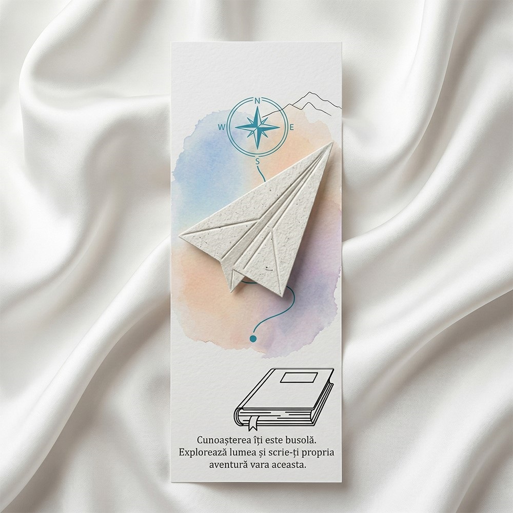Diploma este doar începutul, iar veritabila aventură abia acum începe. Am creat acest semn de carte pentru tinerii exploratori care sunt gata să decoleze spre noi orizonturi, având cunoașterea drept singura busolă necesară. Un design matur, acompaniat de un avion din hârtie plantabilă, pregătit să transforme finalul studiilor într-un nou început înfloritor.