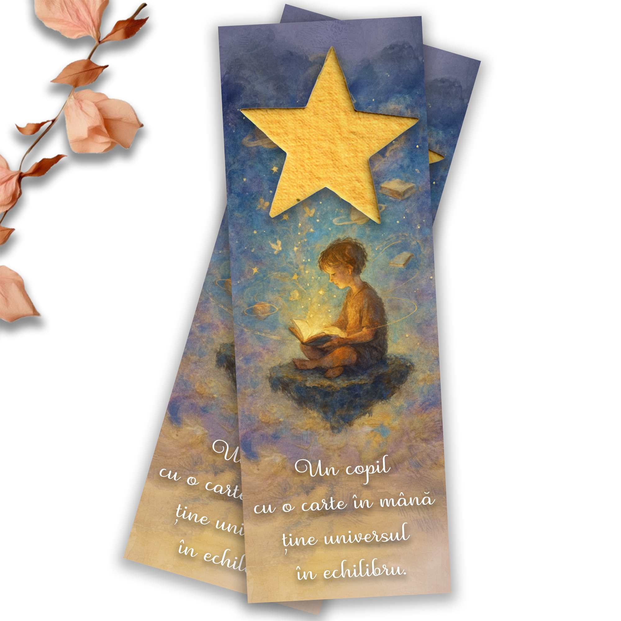 Pe un fundal de cer, cu cărți zburând printre nori și un copil prins în lumea lecturii, am adăugat o stea din hârtie plantabilă, ca simbol al viselor care pot prinde rădăcini.