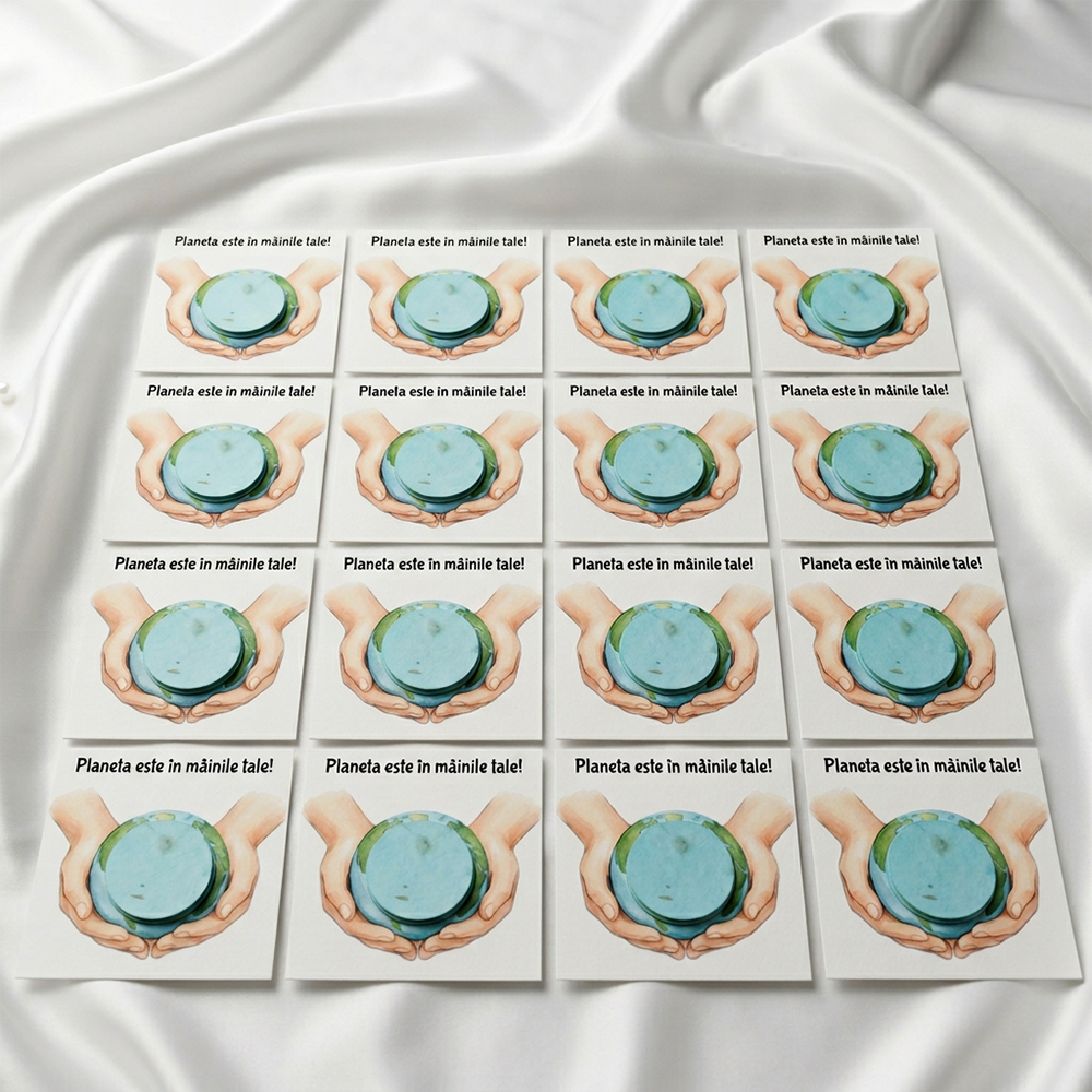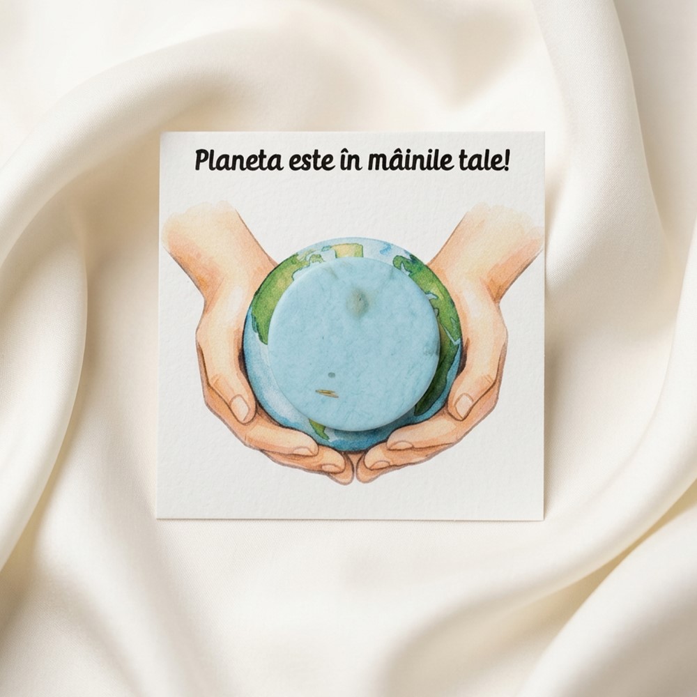Acest set este soluția rapidă pentru o oră de ecologie interactivă. Pachetul acoperă perfect necesarul pentru o jumătate de clasă sau o grupă. Designul frontal are un mesaj vizual puternic: două mâini care susțin globul pământesc. Planeta este reprezentată fizic de o figurină rotundă, albastră. Aceasta este realizată manual din hârtie biodegradabilă, îmbogățită cu mix de semințe de flori.